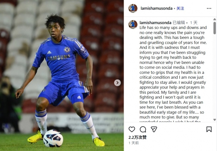 01月09日讯 33岁的退役球员拉米沙·穆松达在社媒公开了自己身患重病的消息,表示自己剩余的生命已经非常短暂。拉米沙·穆松达曾在2012-2014年效力于切尔西青年队,是另一位切尔西球员小查理·穆松达的哥哥。穆松达在社媒写道:“人生充满起起落落,没有人能真正感同身受。过去几年对我来说非常艰难,我一直在努力恢复健康,所以没有使用社交媒体。现在我不得不接受现实,...